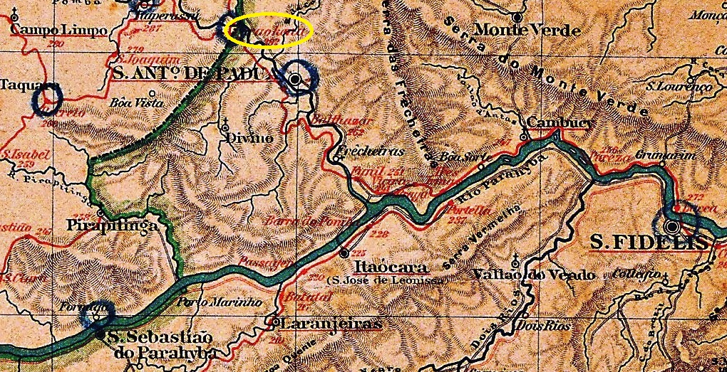 In the imperial province of Minas Gerais there were two rivers called Paraopeba, and two localities named São José do Paraopeba. (See also SMG-2469). This locality was from July 1868 a freguesia of Pomba, located on the south bank of the smaller river Paraopeba (35 km long, a tributary to the Rio Pomba) in Minas Gerais, about 200 km southeast of the provincial capital Ouro Preto. In December 1878, the place name was changed to S. José de Tocantins, probably to avoid further confusion with the place of the same name near Ouro Preto. In September 1923, the district was simply called Tocantins and received its political emancipation as a municipality in December 1948.