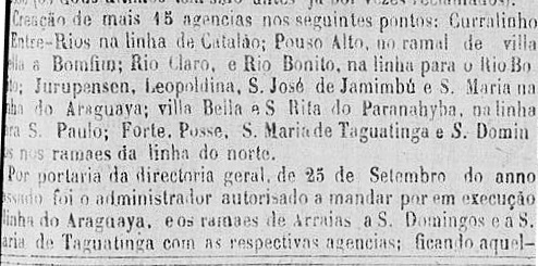 Im Verzeichnis der kaiserlichen Postämter (Tabella das Agencias do Correio do Imperio, Rio de Janeiro, 1885) ist hingegen das Jahr 1881 vermerkt, was der Inbetriebnahme der Agentur entsprechen könnte.
