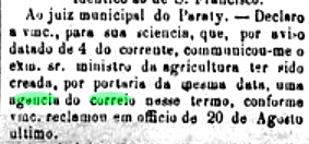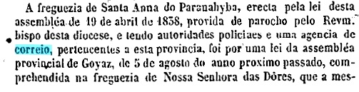 Wie aus der Presse in Rio de Janeiro hervorgeht, wurde im November 1881 beschlossen, ein Postamt in Paraúna einzurichten.