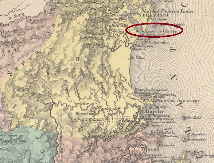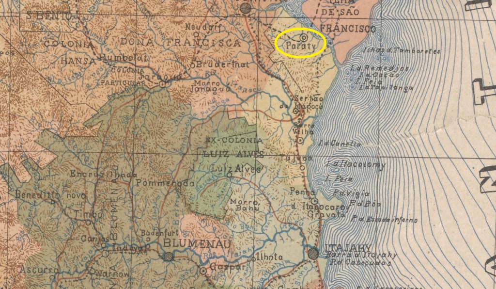 The Freguesia de Senhor Bom Jesus de Paraty existed since June 1854. It belonged to the Vila de S. Francisco and was located on the south bank of the Araquari, 170 kilometres north of the provincial capital Desterro (today Florianópolis). In April 1876, it became a Vila, but lost this status in August 1923 when Paraty was downgraded to the Distrito of Vila de S. Francisco. In October 1925, Paraty once again became an independent município. Since December 1943, it has been called Araquari, presumably to avoid confusion with Paraty in the state of Rio de Janeiro.