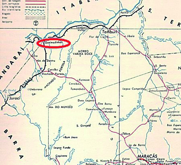 Queimadinhas was a train station of the E.F. Central da Bahia, installed on January 11, 1885 at the right bank of the Paraguaçu River. The post office of this station must have come soon after, for shortly later it was mentioned in the Bahia press: