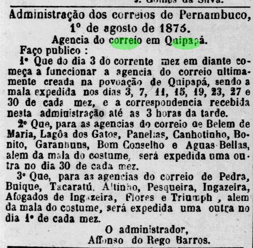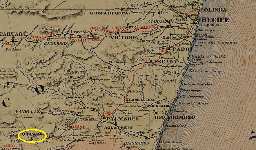 Since June 1857, Quipapá had been a district in the municipality of Panelas, located 180 km southwest of the provincial capital Recife. The village of Nossa Senhora da Conceição de Quipapá was founded in 1879, but the post office had been established four years earlier, as was revealed in a local press note: