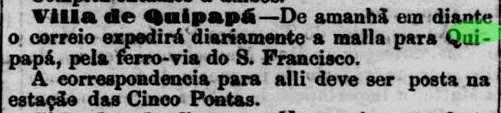 Dieser auch für brasilianische Ohren merkwürdige Name hat zwei mögliche Erklärungen. Er kommt entweder von Quipacá, was in einem afrikanischen Dialekt so viel wie Sklavenversteck bedeuten würde, oder von Quipaquipá, was in der Indianersprache viele Kakteen hieße. Der Guia Postal do Império für 1880 zählt über fünfzehntausend Einwohner in Quipapá. Kein Wunder, dass dort ein Bahnhof der Estrada de Ferro do Recife ao São Francisco im Januar 1885 errichtet wurde. Sofort danach wurde die Post dort per Zug befördert: