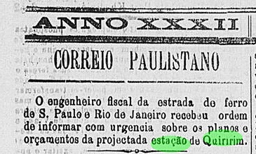 Die Estrada de Ferro do Norte (oder E.F. D. Pedro II) wurde ab 1876 gebaut und sollte São Paulo mit Rio de Janeiro verbinden, was nun im Jahr 1877 in Cachoeira Paulista geschah. Nach Ralph Giesbrecht (estacoesferroviarias.com.br) sollte ab Dezember 1876 eine Haltestelle an der Fazenda Quiririm nah am Nordufer des Paraíba do Sul bei Taubaté, 130 km nordöstlich der Provinzhauptstadt São Paulo errichtet werden, die jedoch im Juli 1885 noch nicht fertig war: