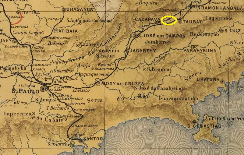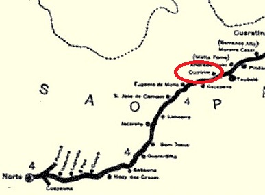 The Estrada de Ferro do Norte (or E.F. D. Pedro II) was built from 1876 on and should connect São Paulo to the D. Pedro II railway near Cachoeira Paulista in 1877. According to Ralph Giesbrecht (estacoesferroviarias.com.br), a train stop was made from December 1876 on at the Fazenda Quiririm next to the north bank of the the Paraiba do Sul River near Taubaté 130 km northeast of the capital São Paulo, but until July 1885 no station house was there: