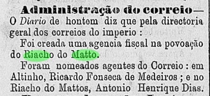 Bis Juli 1875 war das Indianerreservat bereits Geschichte und machte Platz einem ehrgeizigen Siedlungsplan der Regierung, der drei Kolonien vorsah. Ein Paar Monate später kündigte man schon das neue Postamt für Riacho do Matto an: