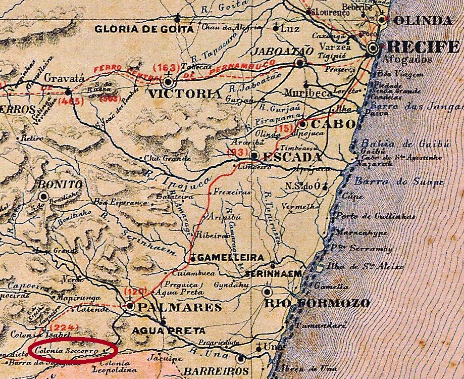 In April 1878, the first train arrived at the Cinco Pontas station, bringing ca. 700 colonists to settle down in Riacho Do Matto, about 30 km away. Most of them were refugees from the drought regions in Brazilian Northeast, but there were also poor people from Recife, who accepted to leave the province capital in change of some land. At the occasion, the new colony was renamed Colonia Soccorro (= Assistance Colony), located between two other ones, Colonia Isabel (see Koester, Carimbologia XII) and Colonia Leopoldina (see map above):
