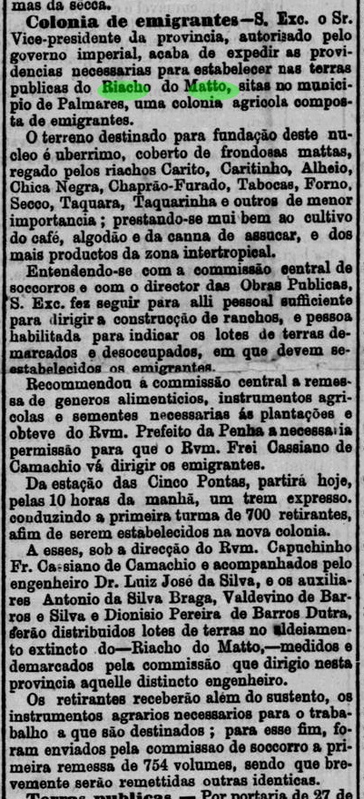 In April 1878 kam der erste Kolonistenzug am ca. 30 km entfernten Bahnhof Cinco Pontas an, um die Neubesiedlung von Riacho do Matto feierlich einzuleiten. Die meisten der neuen Einwohner waren Flüchtlinge aus den Dürregebieten in Brasiliens Nordosten. Dazu kamen aber auch viele Arme aus Recife, die überredet worden waren, mit der Aussicht auf ein Stück Land die Provinzhauptstadt zu verlassen. Diese neue Kolonie wurde Colonia Soccorro genannt, und lag zwischen Colonia Isabel (s.a. Koester, Carimbologia XII) und Colonia Leopoldina. (s. Karte zu Beginn des englischen Textes):