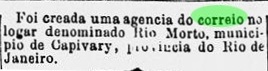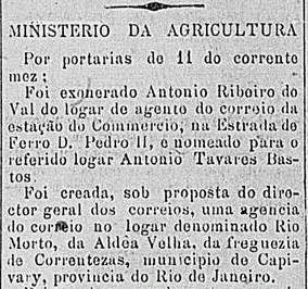 Gleichwohl war diese Agentur nicht im Verzeichnis der kaiserlichen Postämter (Tabella das Agencias do Correio do Império) vom darauf folgenden Jahr zu sehen, wohl weil der Postbetrieb zum Redaktionsschluss noch nicht gestartet war. Wie es dem auch sei, das Postamt wurde im Januar 1886 gleich durch mindestens vier Zeitungen zum zweiten Mal angekündigt: