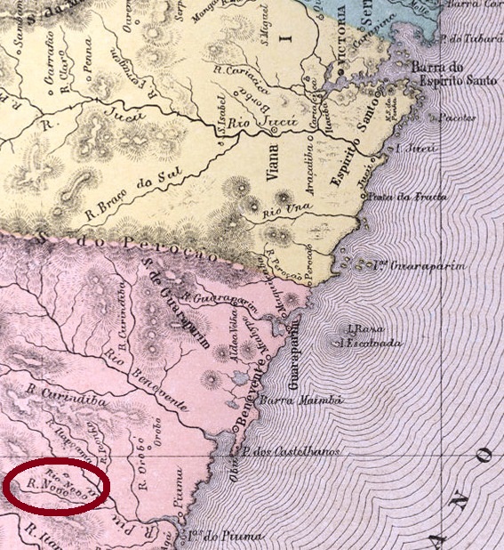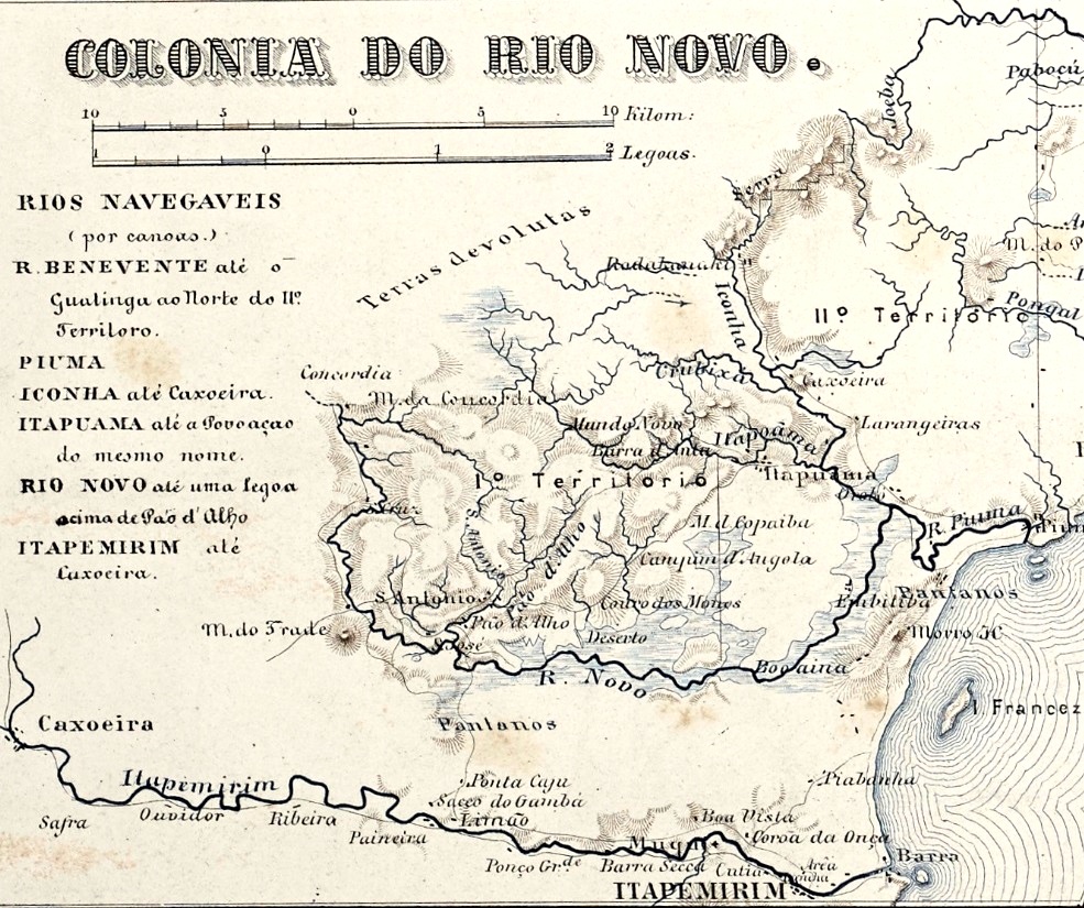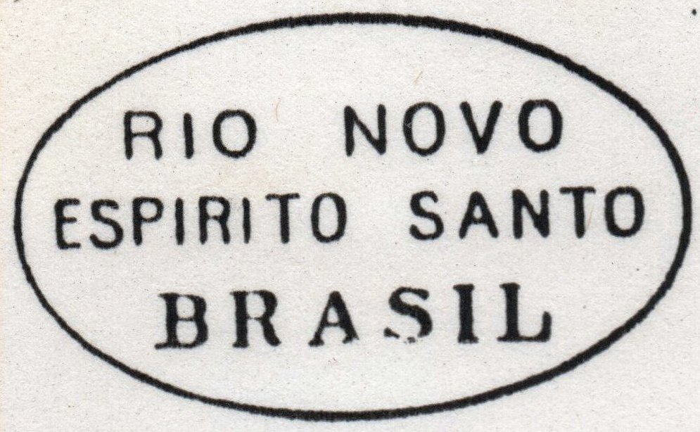 Laut Paulo Novaes (agenciaspostais.com.br) entstand das dortige Postamt im Februar 1882, und die Agentur wechselte den Namen (von Colonia zu Rio Novo) erst in 1885, zwei Jahre nach dem Aufstieg zur Freguesia. Der erste Ortsstempel, RES-0135a, wurde in schwarz und blau bis ca. 1882 gefunden und wurde bereits durch Paulo Ayres (op. cit., 1937) unter Nr. 1437 vorgestellt: