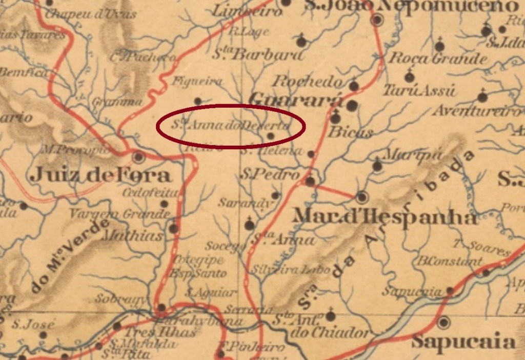 The curious name of this locality (= Holy Ann of the Desert) has often originated confusion with Sant’Anna do Desterro (= Holy Ann of the Exile), an apparently fictive name which was sometimes published in the press, in the Postal Guide of 1880, an even in official documents! The real Sant’Anna do Deserto was since June 1868 a district of the municipality of Barbacena, situated over 250 km south of the ancient province capital Ouro Preto. It belonged from August 1889 until September 1923 to Juiz de Fora; after that, to Mathias Barbosa, before becoming an own municipality in December 1953.