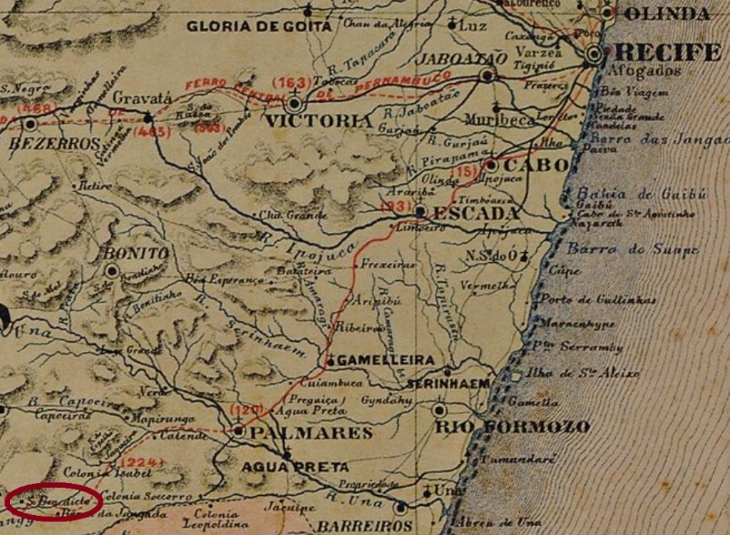 São Benedicto was a train station of the Sul de Pernambuco Railway, built in September 1884 in the municipality of Quipapá, over 170 km southwest of the province capital Recife. A settlement startet shortly after, and in October 1899 a district was established. The train line passed in 1901 to the Great Western Railway. In December 1943 the district was renamed Iraci, seven years later the railway belonged to the Rede Ferroviária do Nordeste. In December 1963 the political emancipation took place with the creation of the municipality of São Benedito do Sul. The railway’s last period (1975-1996) was under the Rede Ferroviária Federal S.A., before operation ended.