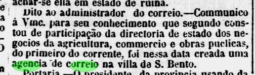 Laut Nova Monteiro (Administrações e Agencias Postaes do Brasil Imperio, in Brasil Filatelico/RJ, 1934-5; Reprint SPP 1994-1999) gibt es dort ein Postamt seit August 1864, wie die Lokalpresse berichtet: