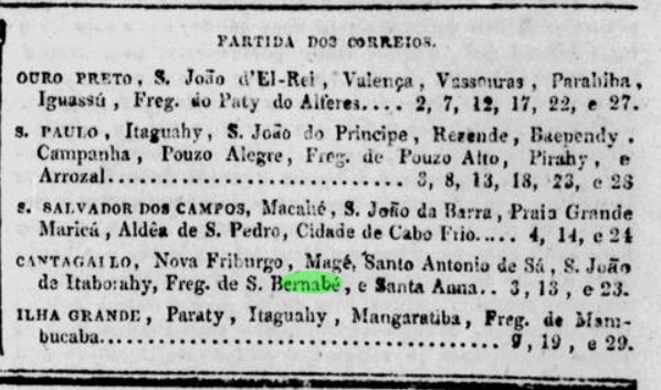 Kein Gründungsdatum fürs örtliche Postamt wurde bisher gefunden. Da aber ab März 1834 eine Postlinie von Rio bis Cantagallo über São Bernabé in der Rio Presse erwähnt wird, muss die Agentur kurz davor errichtet worden sein: