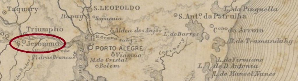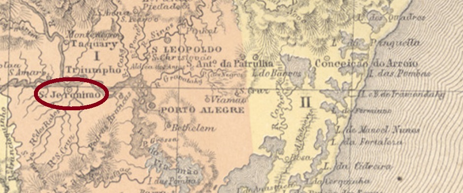 Wie Nova Monteiro in Administrações e Agencias Postaes do Brasil Imperio (Brasil Filatelico/RJ, 1934-5; Reprint SPP 1994-1999) berichtet, gibt es dort ein Postamt seit September 1862. Zwei frühere Abstempelungen wurden gefunden, die wohl nicht die ältesten sind. SRS-0320b (Samml. José A. Junges) kommt in schwarz und blau vor und hat einen Doppelkreis mit Inschrift S. JERONYMO. Die Daten in der Mitte wurden für den Zeitraum 1878-1886 gefunden. SRS-0320c (Samml. José A. Junges) ist fast identisch mit seinem Vorgänger, hier gibt es aber zusätzlich ein Ornament in Kreuzform unten zwischen den Kreisen, das aus kleinen Zweigen formiert wird. Das einzig gesichtete Exemplar ist in blauer Farbe, datiert 1890.
