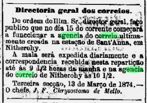 As Paulo Novaes reports (agenciaspostais.com.br), there was a station post office from March 1874 to about 1880. Its start of operations was announced by the Rio press:
