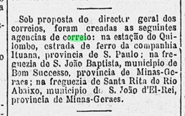 Laut Paula Sobrinho (História Postal de Minas Gerais, Belo Horizonte, 1997) gibt es dort ein Postamt seit Oktober 1885. Das bestätigt die Presse aus Rio: