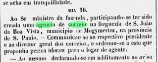 Zur Entstehung des örtlichen Postamts wurden drei verschiedene Daten gefunden. Laut Nova Monteiro (Administrações e Agencias Postaes do Brasil Imperio, in Brasil Filatelico/RJ, 1934-5; Reprint SPP 1994-1999) war ein Postamt Boa Vista bereits im Oktober 1829 gegründet, was eher unrealistisch erscheint. Derselbe Nova Monteiro nennt eine weitere Gründung im Februar 1849, nun unter dem Namen São João da Boa Vista. Dann meldete die Presse aus Rio ein neues Postamt São João da Boa Vista im April 1849: