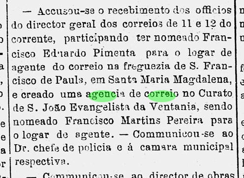 Two creation dates for the local post office have been found. First in January 1876, as can be read in the Rio press: