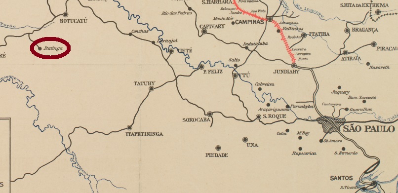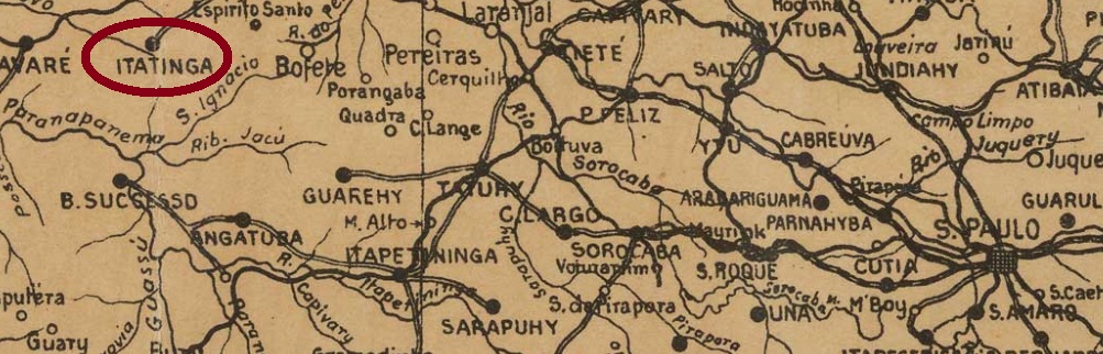 Der bisher früheste Poststempel von dort ist SSP-1680a (Samml. José A. Junges): ein Doppelkreis mit der Inschrift SĀO JOĀO DE ITATINGA oben und einem Ornament in X-Form unten. Die Daten in der Mitte wurden bisher für den Zeitraum 1890-1894 gefunden.