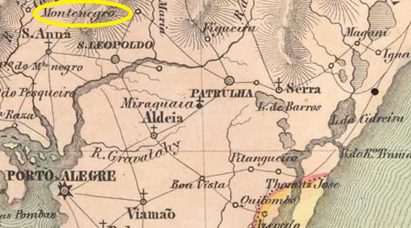 From October 1867, São João do Monte Negro was a district of Triumpho, located on the west bank of the River Cahy (now written Caí), about 60 km northwest of the provincial capital Porto Alegre. In May 1873 it ascended to a villa and in October 1913 to a town, which since January 1916 bears the simplified name Montenegro. Monte Negro means of course Black Mountain and refers to the imposing mountain of Sao João, which characterizes the entire skyline of this pleasant town.