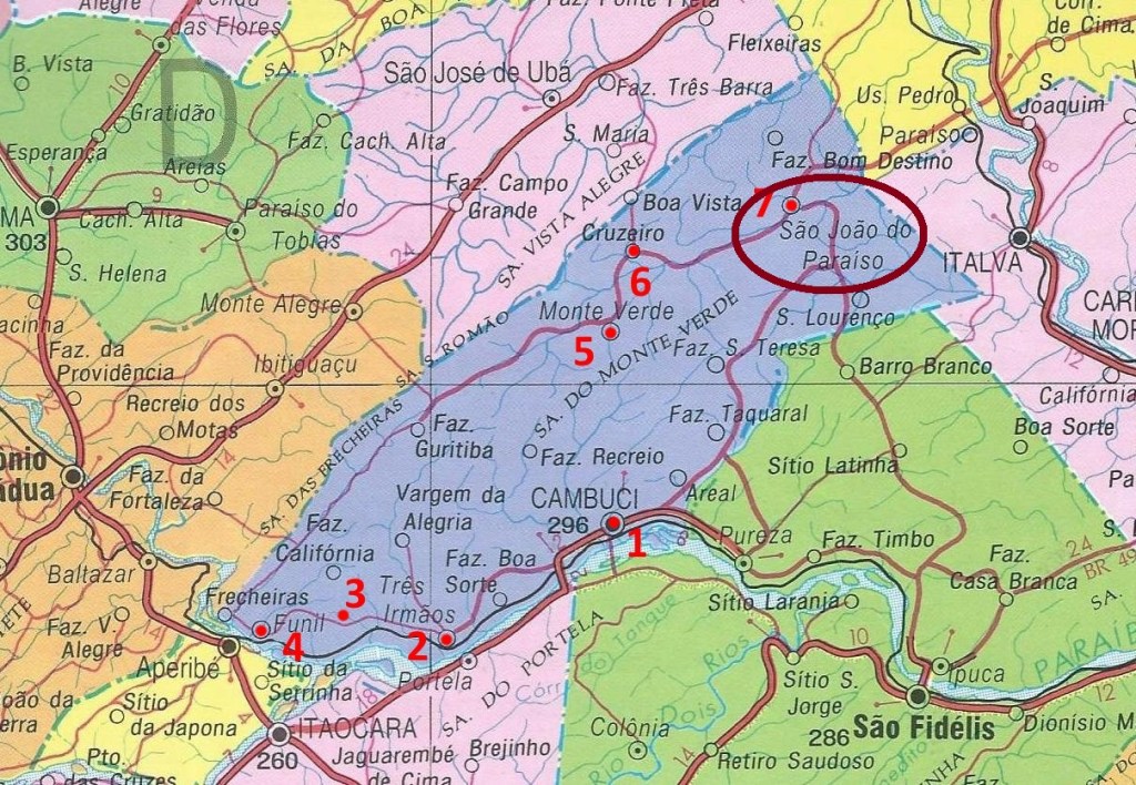São João do Paraizo (later written Paraiso) was a settlement near São Fidelis, about 340 km northeast of the imperial capital of Rio de Janeiro. In November 1879, the town passed as a district to the municipality of Monte Verde, and in December 1938 – now under the toponym Paraisinho – to the then newly founded municipality of Cambuci. It remained so to this day, although the earlier name returned in June 1947.