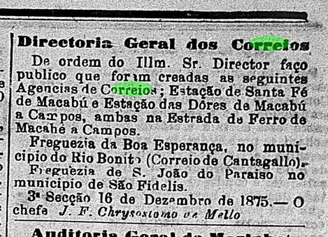 Das örtliche Postamt wurde im Dezember 1875 gegründet, wie aus der Rio-Presse zu entnehmen ist: