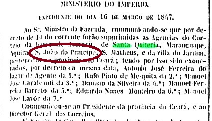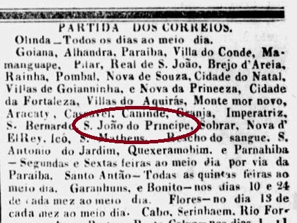 Es sind bereits drei Betriebsperioden fürs örtliche Postamt bekannt, aber es könnte mindestens eine weitere dazu kommen. Aus der Pernambuco-Presse geht hervor, dass schon im April 1836 Poststaffeten von Recife bis Parnahiba in der Provinz Piauhy zweimal in der Woche unterwegs waren, die auch São João do Principe in Ceará bedienten, was wohl die Existenz eines Postamts dort voraussetzt: