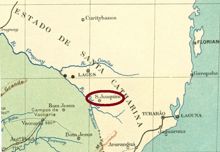 The town of São Joaquim, now known nationwide for its apples, its wines and its cold climate, is located more than 1350 m high on the mountain slope (Costa da Serra) of the former province of Santa Catarina, about 230 km southwest of the state capital Florianópolis, which was then the provincial capital Desterro. In May 1871 it was elevated to a district of Lages and received the political-administrative emancipation as a villa in August 1886. Since October 1924, São Joaquim has been a town.