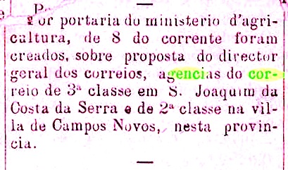 An imperial postmark is also known: SSC-0220a (Coll. José A. Junges) consists of a double circle, bearing above the inscription S. JOAQM. DA COSTA DA SERRA. There is an ornament in diamond form below, the four sides of which are open. The dates at the centre were found so far within the period 1884-1890.