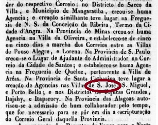 The Imperial Mail Register (Tabella das Agencias do Correio do Imperio) of 1885 reports a post office there since 1875. However, new research has shown that as early as 1840 a post office was in operation on site, as can be seen from a ministerial report of May 1841: