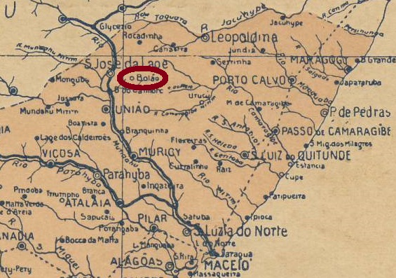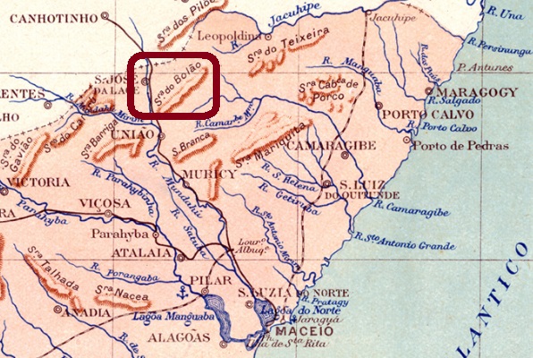 Here is another village that has disappeared from the map today. In 1871 it became a freguesia from Villa da Imperatriz, which was located about 120 km north of the provincial capital Maceió. In September 1890, it was transferred as a district to the newly founded municipality of União dos Palmares. The 1920 census still recorded a local population of more than 13 thousand, but a health disaster must have occurred afterwards, which displaced the population. Today, only the name Serra do Bolão has remained: a low mountain range near União dos Palmares.