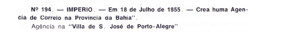 Three different dates were found for the creation of the local postal agency. The oldest of these would be July 1855, as Aureo G. Santos reports in Agências de Correio Criadas e Suprimidas 1851, 1855, 1856 e 1857 (in Brasil Filatélico 181, Rio de Janeiro, 1977):
