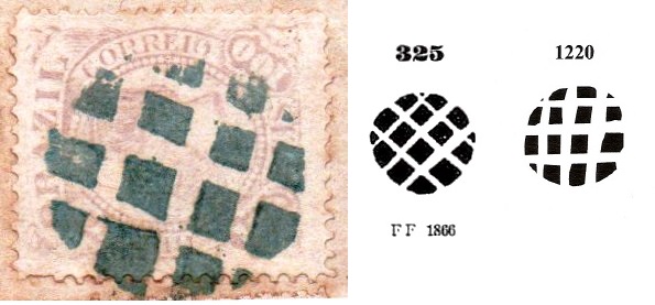 A local cancel and a mute cancellation were found, both from near the end of the Empire. SBA-0625b (Coll. José A. Junges) has a double circle with the inscription S. J. DE PORTO ALEGRE above. The dates inside vary from 1881 until 1883. The mute cancel was found on a fragment from 1883 and bears great resemblance to cancel No.325 by Paulo Ayres (Catalogo de Carimbos Brasil-Império, S. Paulo, 1937, 1942), as well as to cancel No. 1220 by J. Dingler and K. W. Lopes (Mute Cancellations of the Brazil Empire / Carimbos Mudos do Brasil Império, Brazil Philatelic Association, Rio de Janeiro, 2000):