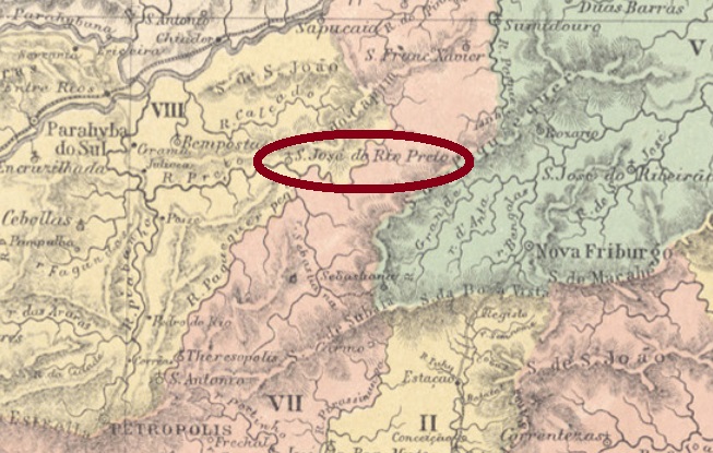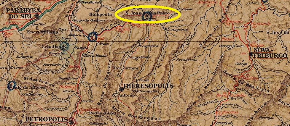 This Rio Preto (= Black River) emerges from the mountains of the same name in the north of the province of Rio de Janeiro. From November 1815, the village of Rio Preto was a freguesia of Niteroi, about 130 km north of the colonial capital Rio de Janeiro. The freguesia went from 1833 as a district to Parahyba do Sul and from May 1892 to Petropolis. Since then, the place changed its name three times: in March 1938 to São José, in December 1943 to Paraúna, and in June 1947 to the district of São José do Rio Preto. Since December 1987, it has been the municipality of S. José do Vale do Rio Preto.