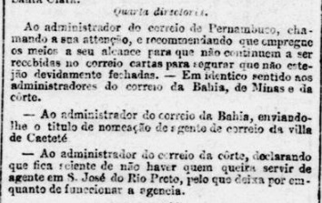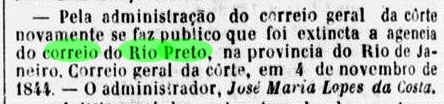 The local post office opened twice: first, about 1839, and it was closed in November 1844, as can be read in the press from Rio: