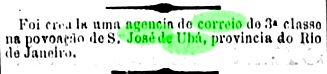 Der einzige bisher gefundene Poststempel aus dem Kaiserreich, SRJ-2220a, (Samml. José A. Junges) kommt auch in der Farbe Karmin vor und hat einen Doppelkreis mit der Inschrift S. JOSÉ DE UBÁ oben und einem Ornament in Raute unten, dessen vier Seiten offen sind. Daten in der Mitte: 1884 bis 1898.