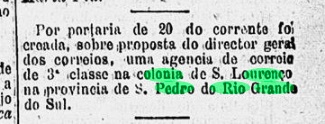 Das örtliche Postamt wurde im Oktober 1882 ins Leben gerufen, wie die Presse aus Rio berichtet: