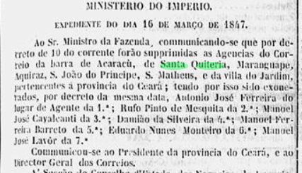 Zwei Betriebsperioden fürs örtliche Postamt wurden gefunden, es könnte eine dritte dazwischen sein. Die erste Periode fing bereits vor April 1836 an, da um diese Zeit eine Postroute von Recife in der Provinz Pernambuco bis Parnahiba an der Provinzgrenze zwischen Piauí und Maranhão durch São Matheus in Ceará ging, wie die Presse aus Pernambuco berichtet: