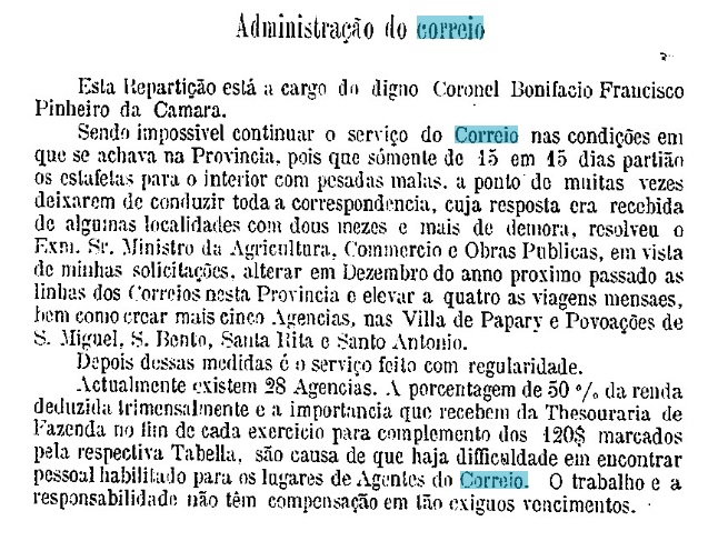 Two founding years for the local post office were found. First in 1848, as can be read in the Imperial Mail Register (Tabella das Agencias do Correio do Imperio, Rio de Janeiro, 1885). Then in 1875, as can be read in the provincial president’s report of May of that year: