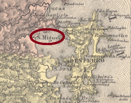 Like its namesake in the province of São Pedro do Rio Grande, this São Miguel of the neighbouring province of Santa Catarina has an eventful history. The settlement officially started in 1747, the village was located about 40 km northwest of the future capital Desterro (today Florianópolis) and became already in March 1833 a villa. Three descents to district followed: in July 1873 subordinated to Tijucas, in August 1886, to S. João Evangelista de Biguassu and most recently in April 1894, again to Biguassu (today written Biguaçu). In between, in April 1875 and 1888, the headquarters of a villa was in Sao Miguel. Since December 1943, the town has been called Guaporanga. The name has native American origin, describing a medicinal plant of the Myrtaceae family (Marlierea tomentosa, Cambess):