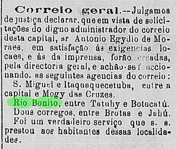Laut Verzeichnis der kaiserlichen Postämter (Tabella das Agencias do Correio do Imperio, Rio de Janeiro, 1885) gibt es dort ein Postamt seit 1872, und das bestätigt die Presse aus São Paulo: