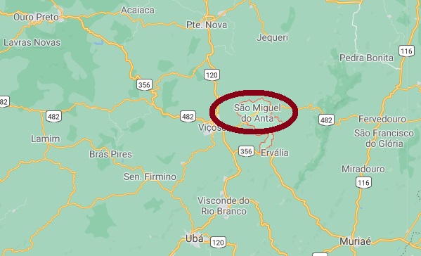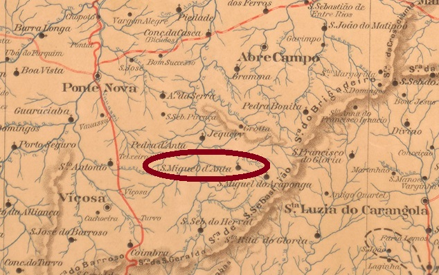 As Paula Sobrinho writes in Historia Postal de Minas Gerais (Belo Horizonte, 1997), there has been a post office there since September 1880. Two early postmarks were found. SMG-2525a (Coll. José A. Junges) has a double circle with the inscription S. MIGUEL DO ANTA above and an ornament in diamond made of four small diamonds. One single copy was seen, with date of 1885 inside. SMG-2525b (Coll. José A. Junges) is probably already Republican: a double circle with the inscriptions S. MIGUEL DO ANTA above and (MINAS) below. Dates inside from 1898 to 1904.