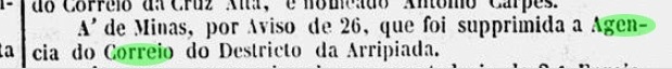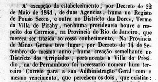 As Paula Sobrinho reports in Historia Postal de Minas Gerais (Belo Horizonte, 1997), there has been a post office there since September 1880. Nevertheless, new research has revealed that a post office was established there as early as September 1841, as confirmed by a ministerial report of that year: