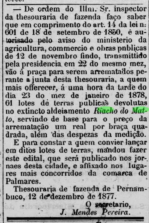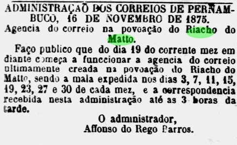 By July 1875, the Indian reservation was history, making way for an ambitious government settlement plan that included three colonies. A few months later, the new post office for Riacho do Matto was announced: