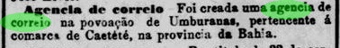 In der kaiserlichen Provinz Bahia gab es mindestens fünf Ortschaften, die Umburanas hießen, und wenn wir wissen, wie schwer man an postalischen Belegen des 19. Jahrhunderts aus dieser Gegend kommt, wird die Zuordnung der Poststempel zu einer schwer lösbaren Aufgabe. Umburana, auch Amburana oder Imburana genannt, ist die allgemeine Bezeichnung für eine Pflanzengattung der Familie Fabaceae, deren Baumrinde und Samen wertvolle medizinische Eigenschaften aufweisen. Das Holz wird auch zur Herstellung von Cachaça-Fässern verwendet: