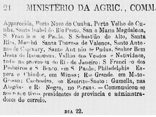 Das Postamt eröffnete wieder 1873, allerdings im Nachbarort Conceição da Ponte Nova. Für diese Poststempel siehe R. Koester: Carimbologia XIII.