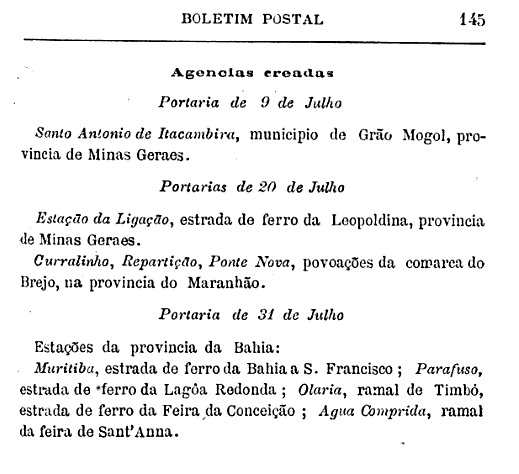 Das Bahnhofspostamt entstand erst im Juli 1889, wie der Boletim Postal Nr. 4 berichtet: