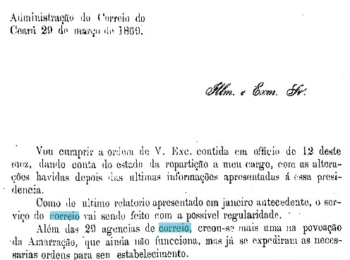 The local post office was created in 1868/69, according to a communication from the Ceará regional postal administration in March 1869: