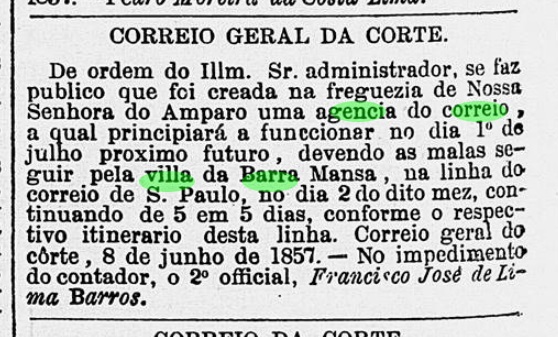 Three periods of operation were found for the local post office in the Empire. For the first time in 1854, as can be read in the Directory of Imperial Post Offices (Tabella das Agencias do Correio do Imperio, Rio de Janeiro, 1885). Then again in June 1857, as shown in the regional press: